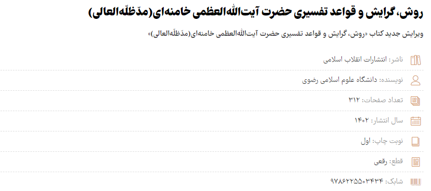 گفتنی‌ است کتاب حاضر، یک نوبت در سال ۱۳۹۳ با عنوان «مروری بر مبانی، روش و قواعد تفسیری حضرت آیت‌الله‌العظمی خامنه‌ای(مدّظلّه‌العالی) در تفسیر سوره‌ی برائت» چاپ شده بود و اکنون با بسط مطالب، ارائه‌ی دلایل، شواهد و نمونه‌های بیشتر در مباحث و توسعه‌ی عناوین، گسترش یافته و با حجم بیش از دو برابر، در قالب اثری مستقل با ۳۱۲ صفحه در اختیار پژوهندگان علوم قرآنی قرار گرفته است.
